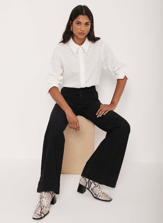 White Cotton Blend Pearl Collar Shirt