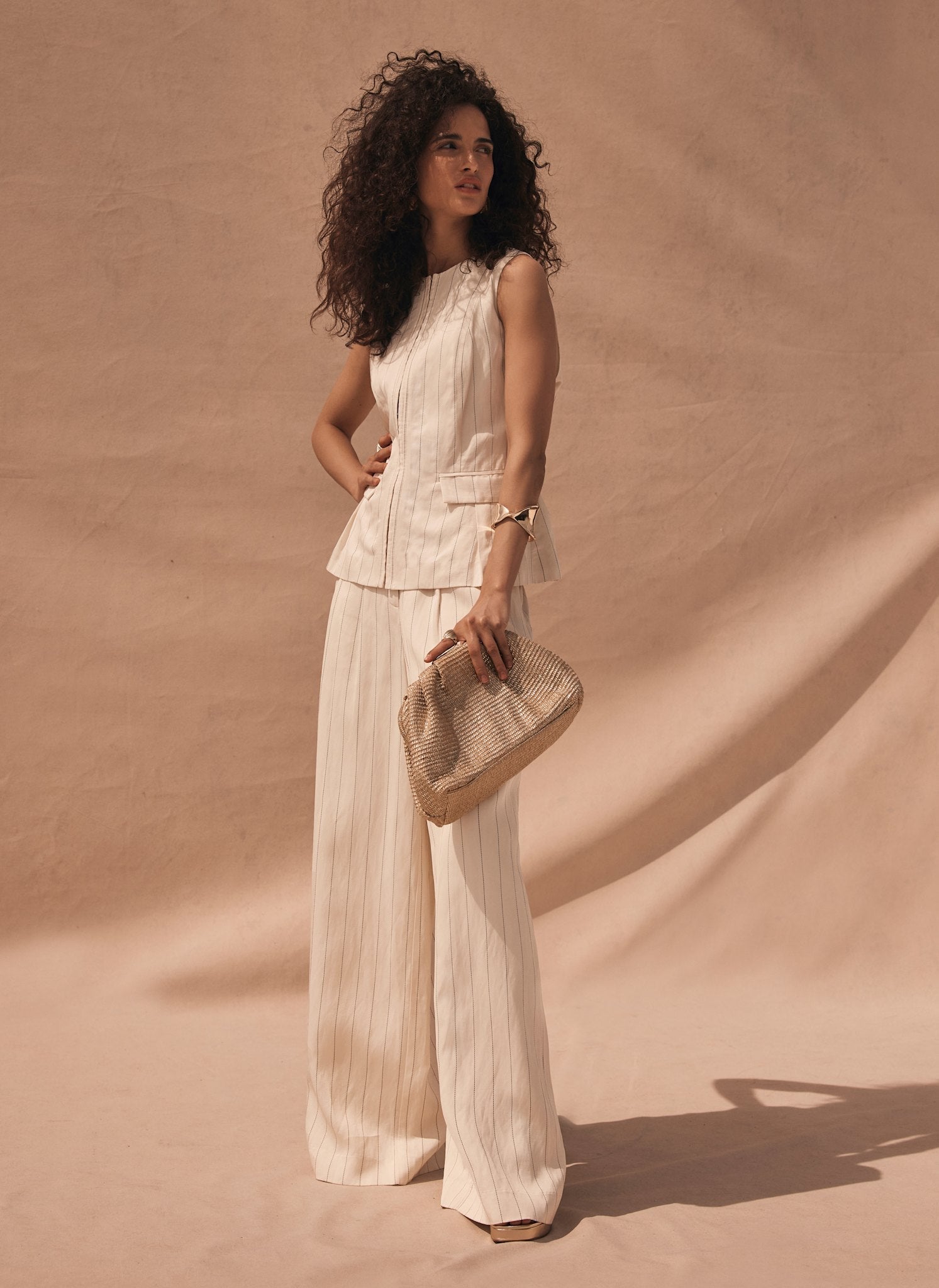 Cream Pinstripe Wide Leg Trousers