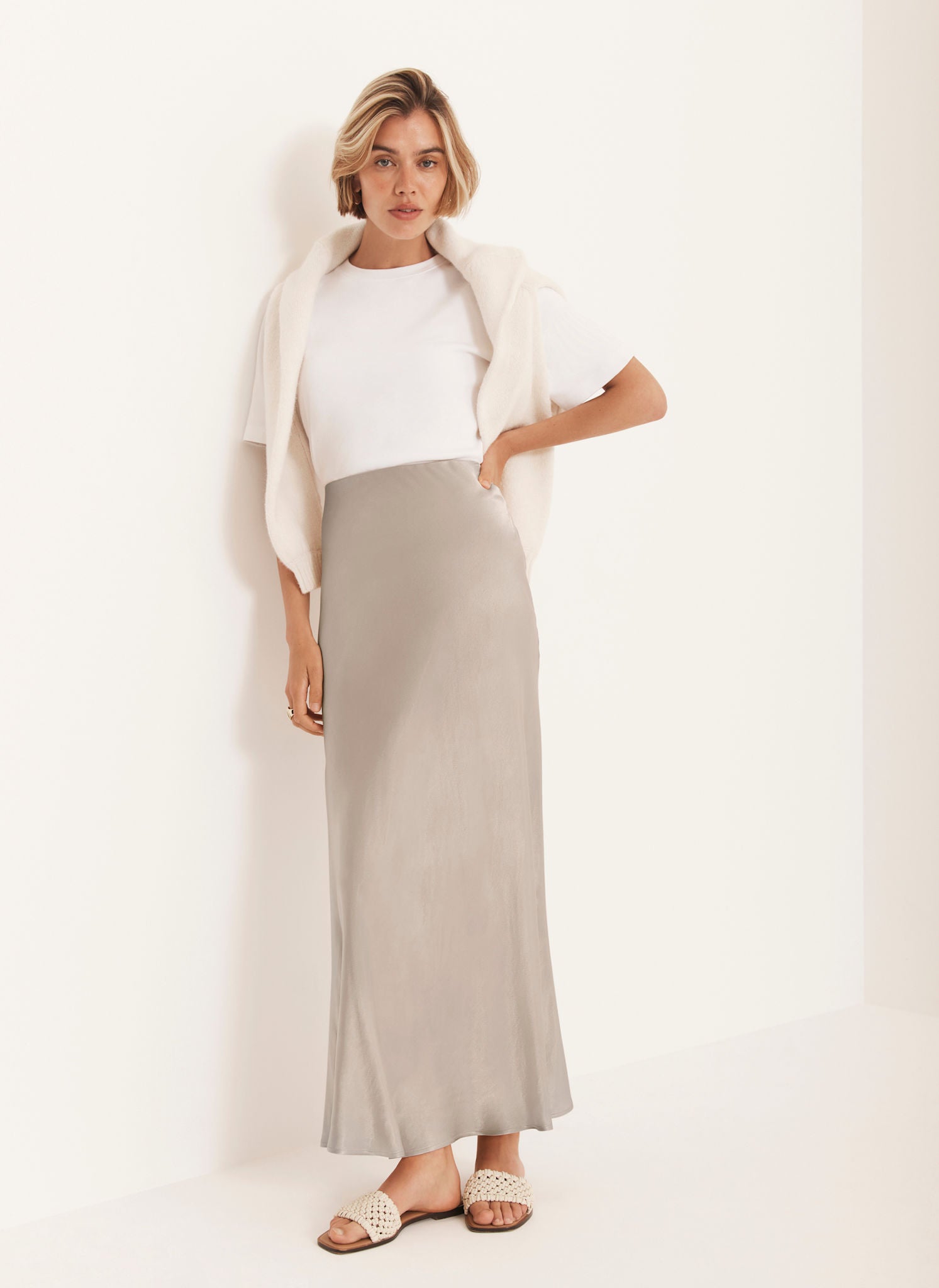 Neutral Satin Slip Midi Skirt
