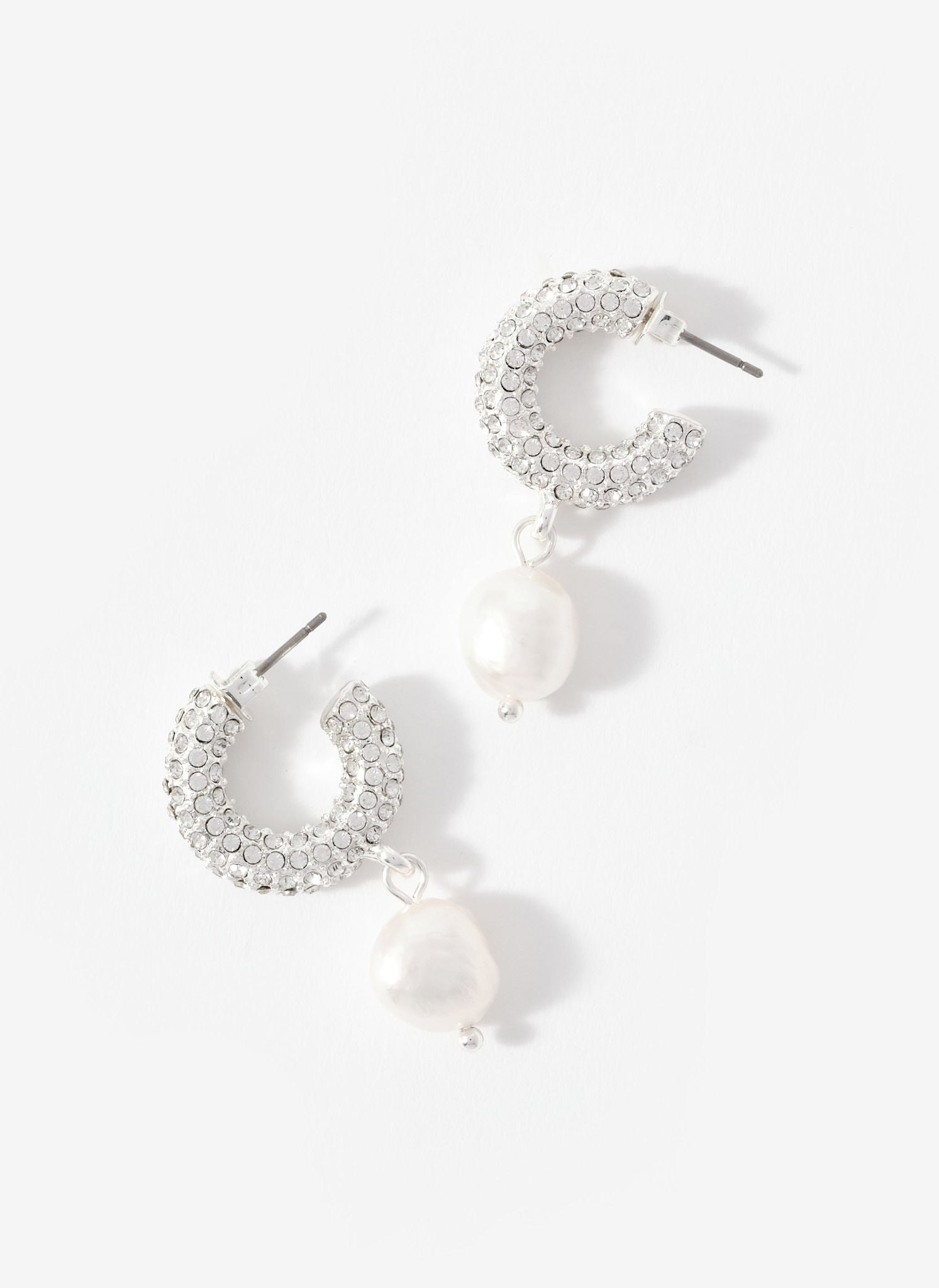 Silver Tone Pave Hoop Pearl Earrings